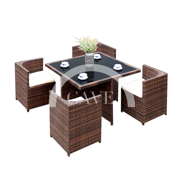 The Ethan Compact Outdoor Dining Set in Brown is a contemporary outdoor furniture set that is suitable for compact outdoor spaces such as small terraces and rooftops. This outdoor dining set consists of one table and four chairs that can be tucked in under the table into a compact shape, a space saving feature that is perfect for Hong Kong apartment buildings. This stylish outdoor dining set is made of woven PE Rattan. Synthetic rattan is durable and is UV resistant and water resistant - a great material for outdoor furniture in Hong Kong. The Ethan Compact Outdoor Dining Set in brown rattan is easy to maintain and clean. The chairs come with seat cushions in water resistant fabric. Contact us for current lead times.